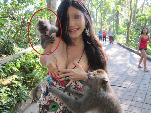峇里島的猴子竟然懂得施展「祿山之爪」?一位身穿平口洋裝的辣妹到峇里島聖猴森林遊玩時,被兩隻猴子攀上身,其中一隻大猴子竟朝她「襲胸」,將她的洋裝整件從胸口拉下,辣妹當場花容失色;一旁的小猴子見狀,還驚訝的張開嘴,表情非常有戲。