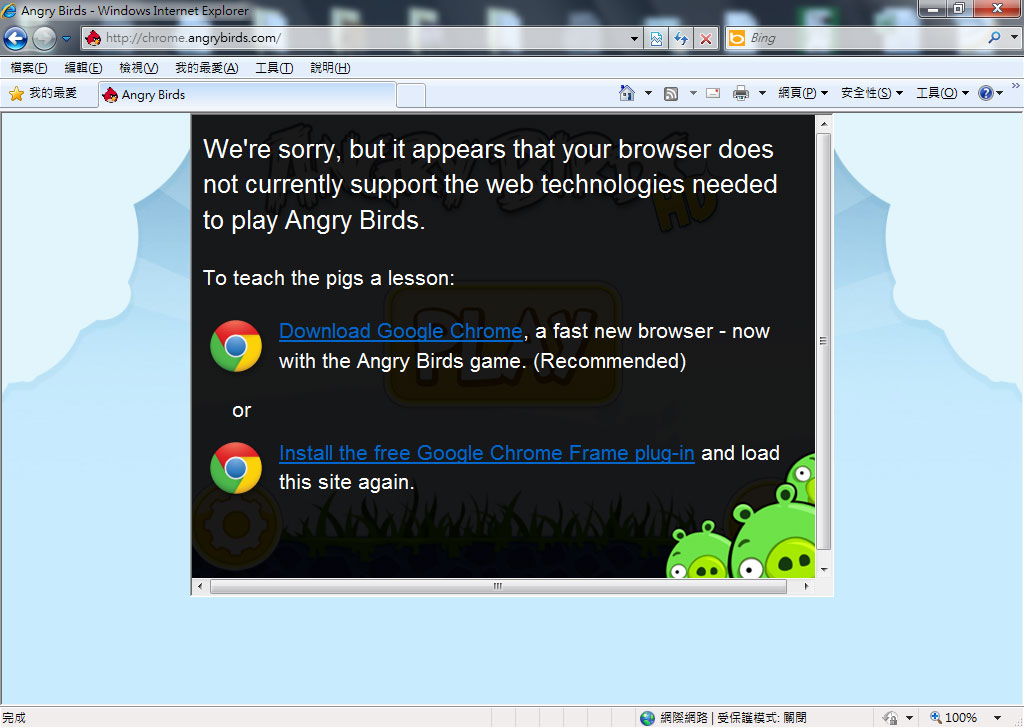 IE8 請點第二個連結安裝 Google Chrome Frame plug-in 才能玩